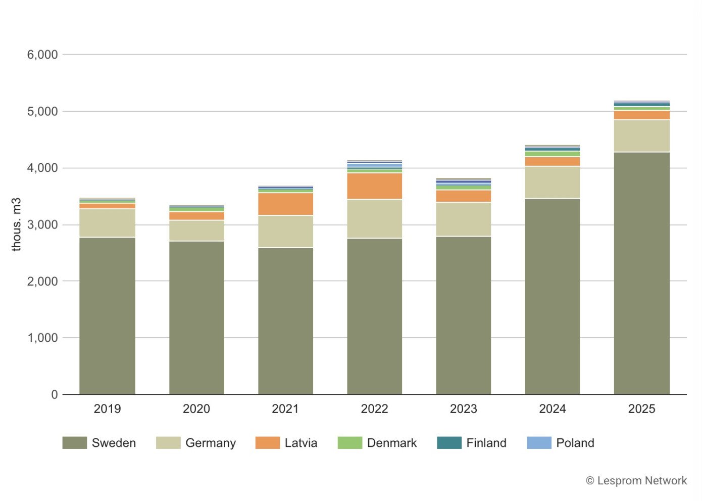 Latvia, Denmark, and Finland together accounted for 6% of Norway’s total log exports in 2025. Exports to Latvia decreased 8% to 169 thousand m3, while shipments to Denmark and Finland fell by 4% and 11% respectively. The United Kingdom imported 20 thousand m3 of logs from Norway, a 6% decline, but the value of exports rose 13% to $10 million due to higher prices of $523 per m3. Bild: Distribution of Norway’s log exports by destination, 2019–2025. Sweden remained the dominant market, accounting for the largest share of export volume throughout the period, followed by Germany and Latvia / Lesprom Analytics