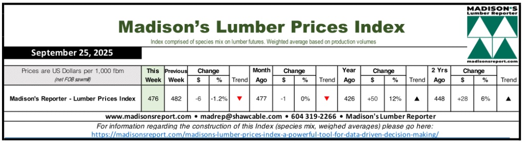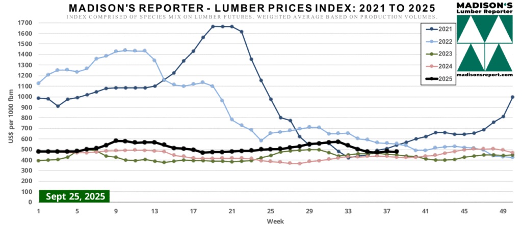 The Madison’s Lumber Prices Index for the week ending September 25, 2025 was US$476 mfbm. This is down -1%, or -$6, from the previous week when it was US$482. This is down -0%, or -$1, from one month ago when it was US$477.
