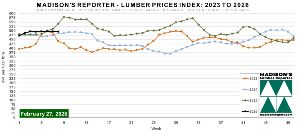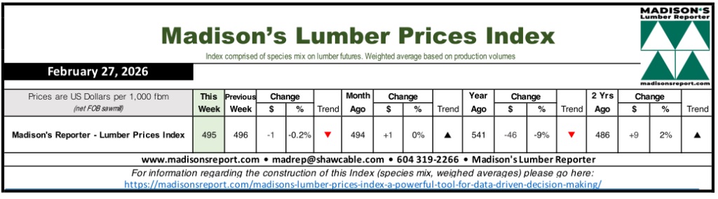 The Madison's Lumber Prices Index registered $495 mfbm for the week ending February 27, 2026, a decrease of $1 from the previous week's reading of $496 mfbm. The index remains $1 above the level recorded one month ago when it stood at $494 mfbm.