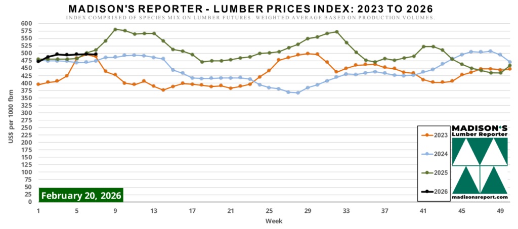 The Madison's Lumber Prices Index registered US$496 mfbm for the week ending February 20, 2026, a decline of US$1 from the previous week's reading of US$497. The index remained unchanged from its level one month ago.