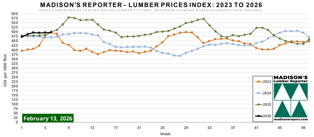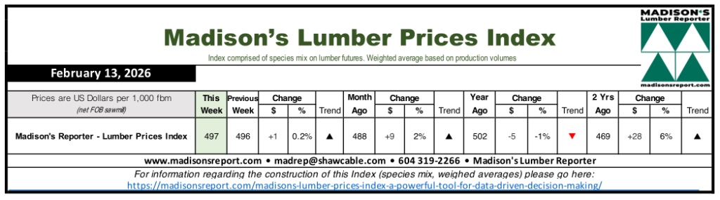 The Madison's Lumber Prices Index reached $497 mfbm for the week ending 13 February 2026, a $1 increase from the previous week's reading of $496 mfbm. The index, which tracks key North American softwood species, has risen $9 from its level one month ago. The data was released by the index providers.