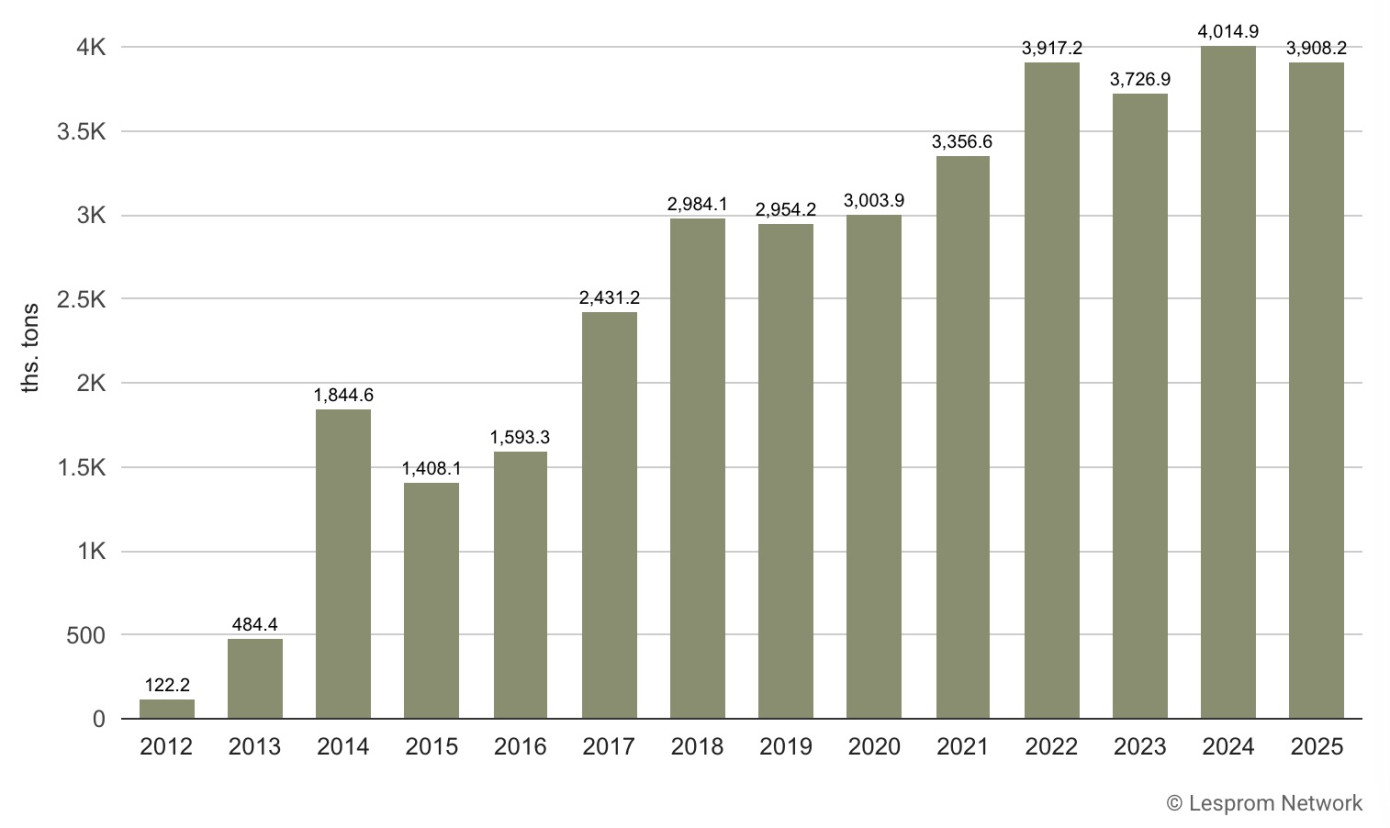 South Korea’s import volumes increased over the past decade, rising from 122 thousand tons in 2012 to 3.91 million tons in 2025, with the peak at 4.01 million tons in 2024. Image: South Korea’s wood pellet import volume, 2012–2025 (thousand tons), showing a rise to a record 4,015 thousand tons in 2024 before easing to 3,908 thousand tons in 2025 / Lesprom Analytics